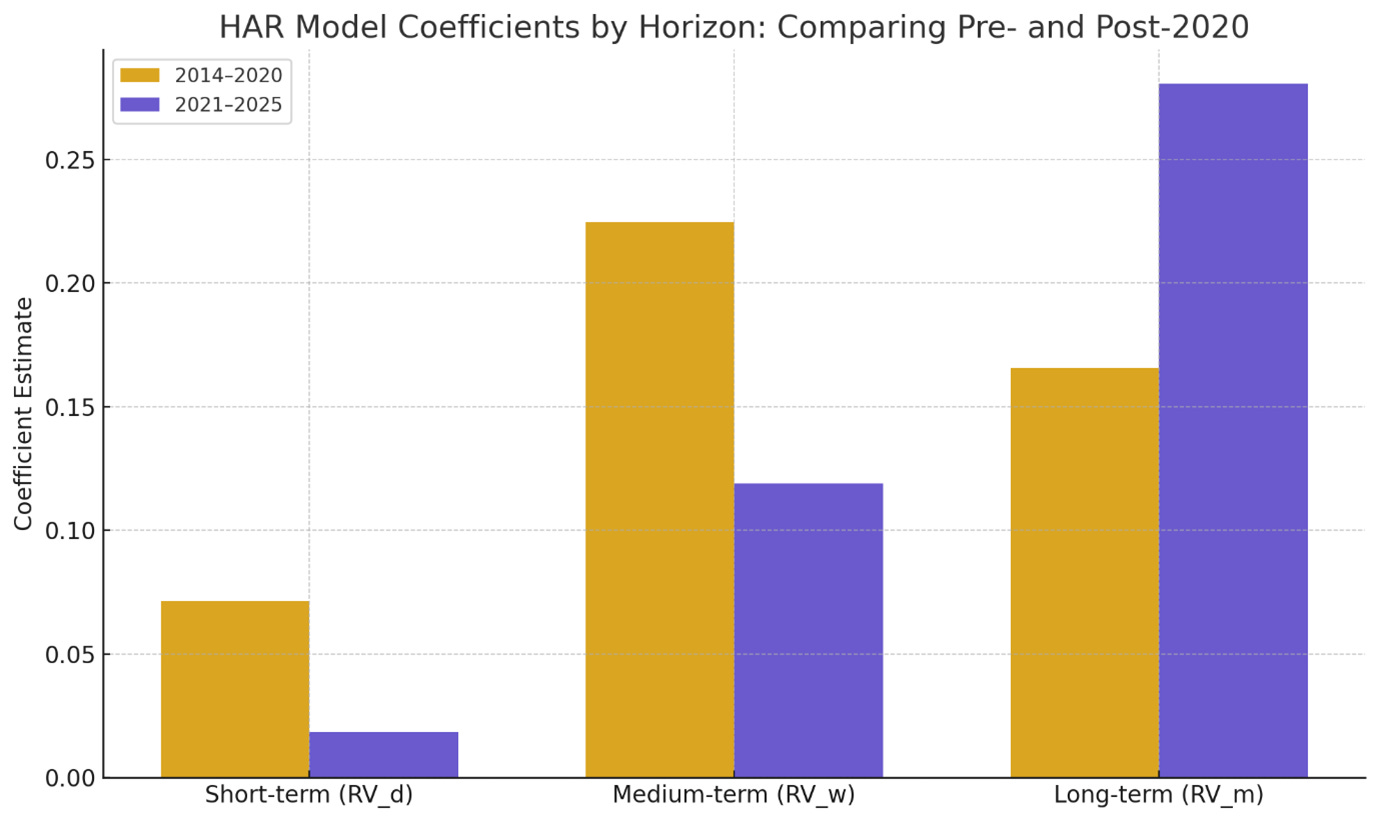 Our side-by-side coefficient bar chart (Figure 6) confirms this re-anchoring. Long-term volatility explains a much larger share of future volatility post-2020, while short-term predictive power almost disappears. This is classic behaviour of an asset transitioning into maturity.