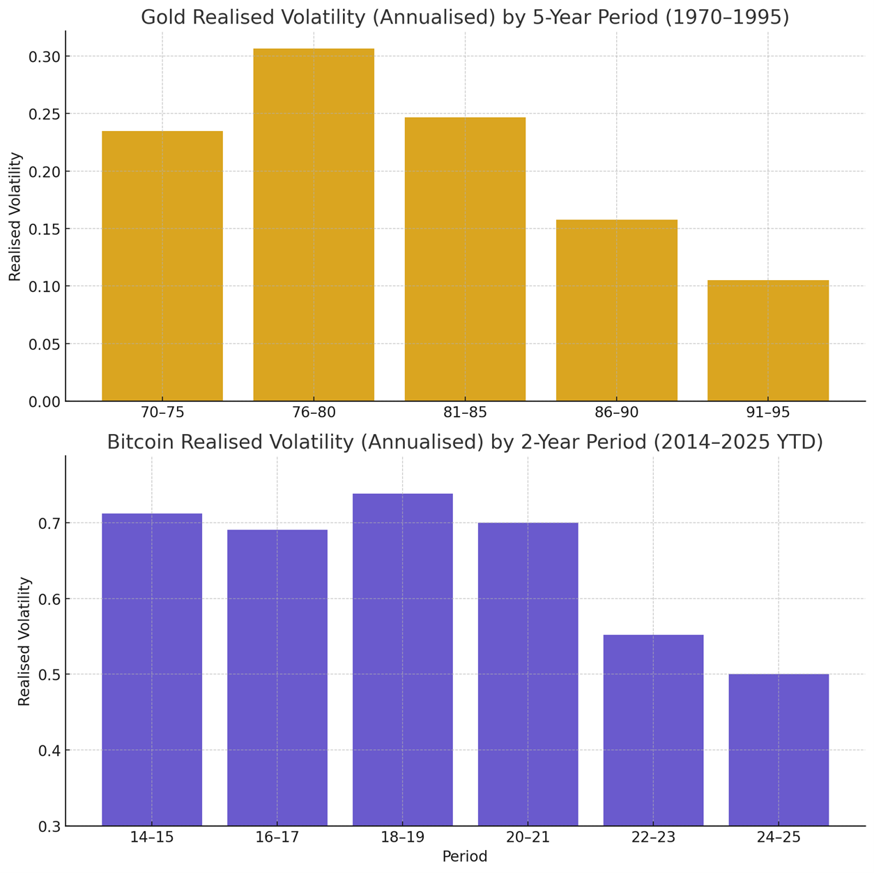 This is the precedent we see now unfolding with Bitcoin. See Figure 2 below for gold's realised volatility by 5-year periods from 1970 to 1995 against 2-year periods from 2014-2025 for Bitcoin.