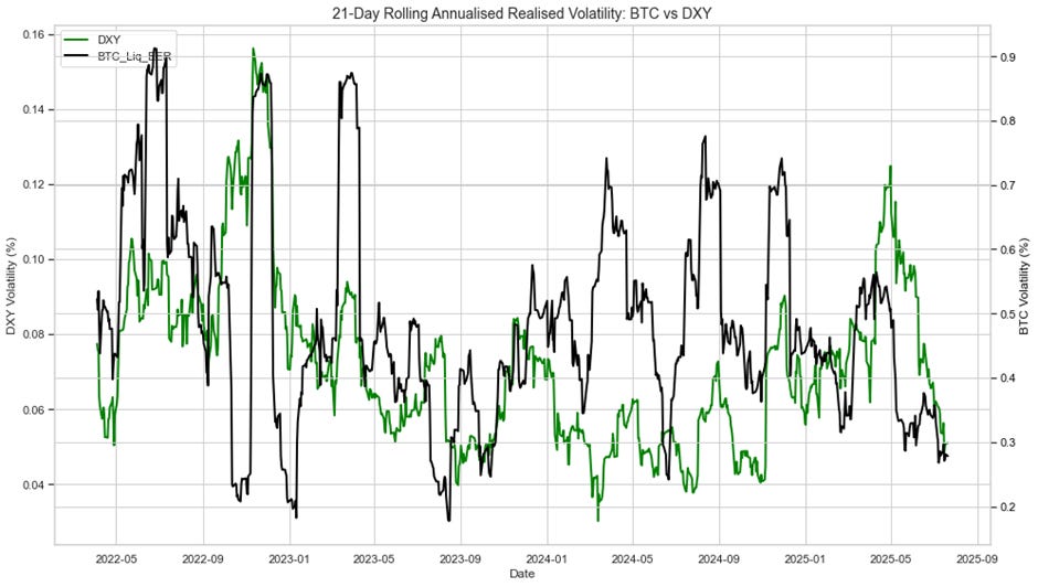 Bitcoin is evolving beyond trend and momentum. It is establishing the risk and return profile of a core macro asset, with its own set of structural drivers. The near-term signal remains bullish. But the long-term implications are more important: Bitcoin is becoming independent. The most recent 2024–25 period shows Bitcoin approaching its all-time low in annualised realised volatility, based on a 21-day rolling window. Notably, Bitcoin has managed to avoid the sharp volatility spikes that have plagued fiat currencies this year. Figure 3 shows a side-by-side comparison of Bitcoin’s rolling volatility against the DXY, underscoring Bitcoin’s growing resilience to global macro shocks.