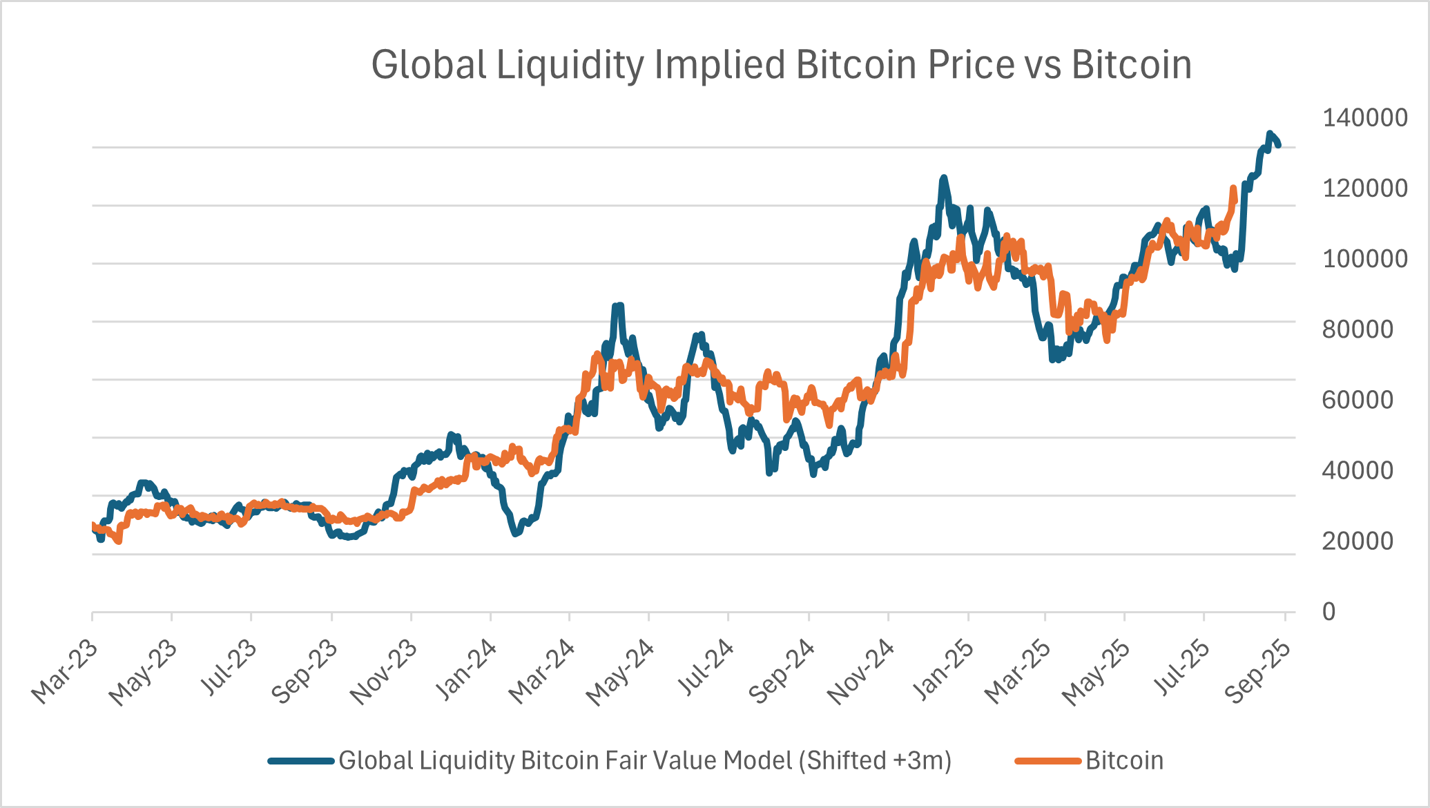 This mirrors gold’s behaviour during periods of liquidity expansion. As noted previously, these changes are further reinforced by the evolving correlation between BTC and global liquidity indicators, which show heightened alignment in both return and volatility dimensions. See Figure 5 for Global Liquidity Implied Bitcoin Price vs Bitcoin.