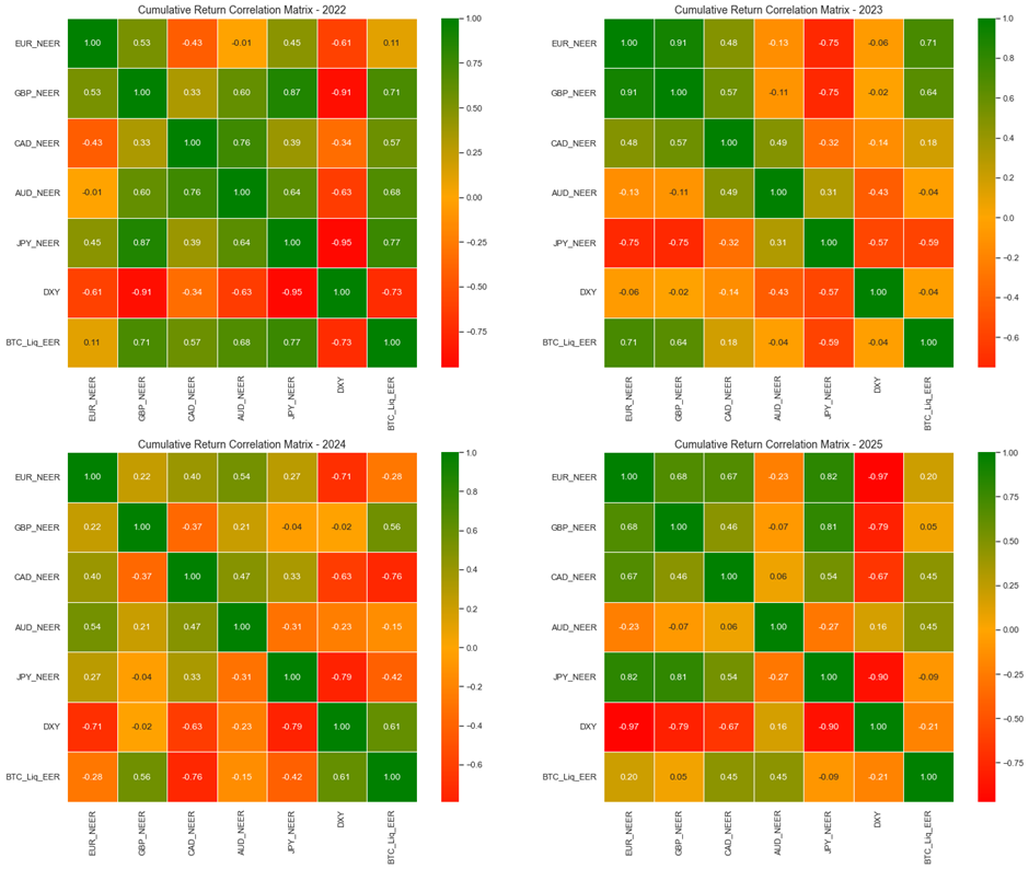 From 2022 to 2025, our FX correlation matrices show a clear transition in Bitcoin's fiat linkage. Initially, Bitcoin's return correlations with fiat currencies were erratic and low. However, a shift is evident from 2023 onwards, where Bitcoin began exhibiting stronger co-movements with pro-cyclical commodity currencies such as AUD and CAD, while showing persistent negative correlation with the US Dollar. See Figure 4 for cumulative return correlations.